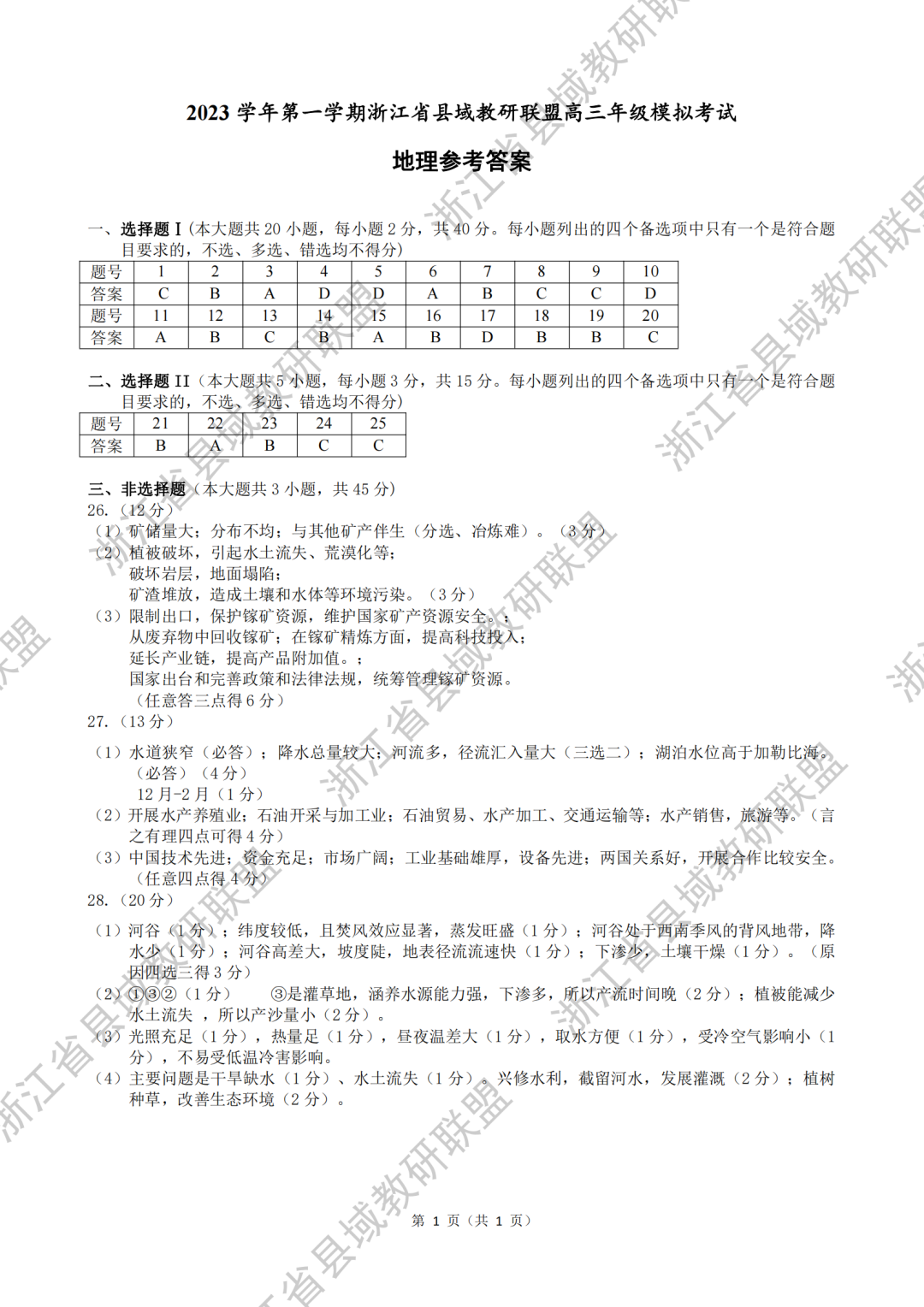 2023学年第一学期浙江省县域教研联盟高三年级模拟考试 地理答案