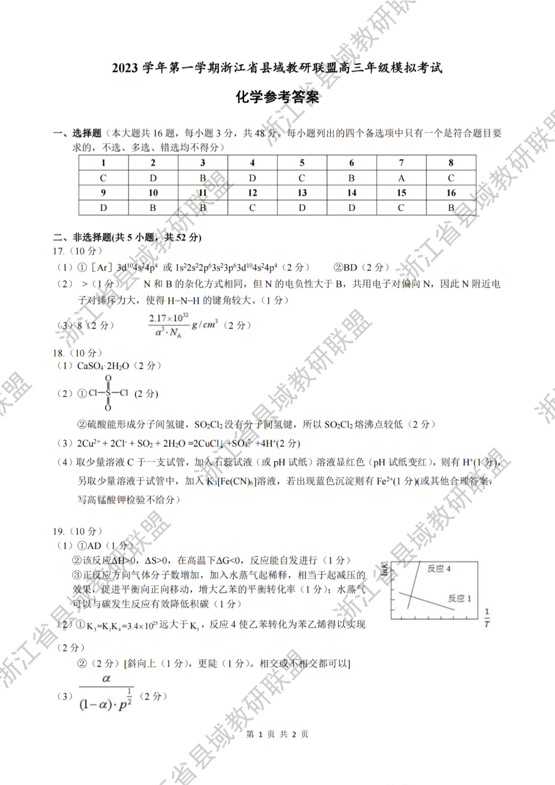 2023学年第一学期浙江省县域教研联盟高三年级模拟考试 化学答案
