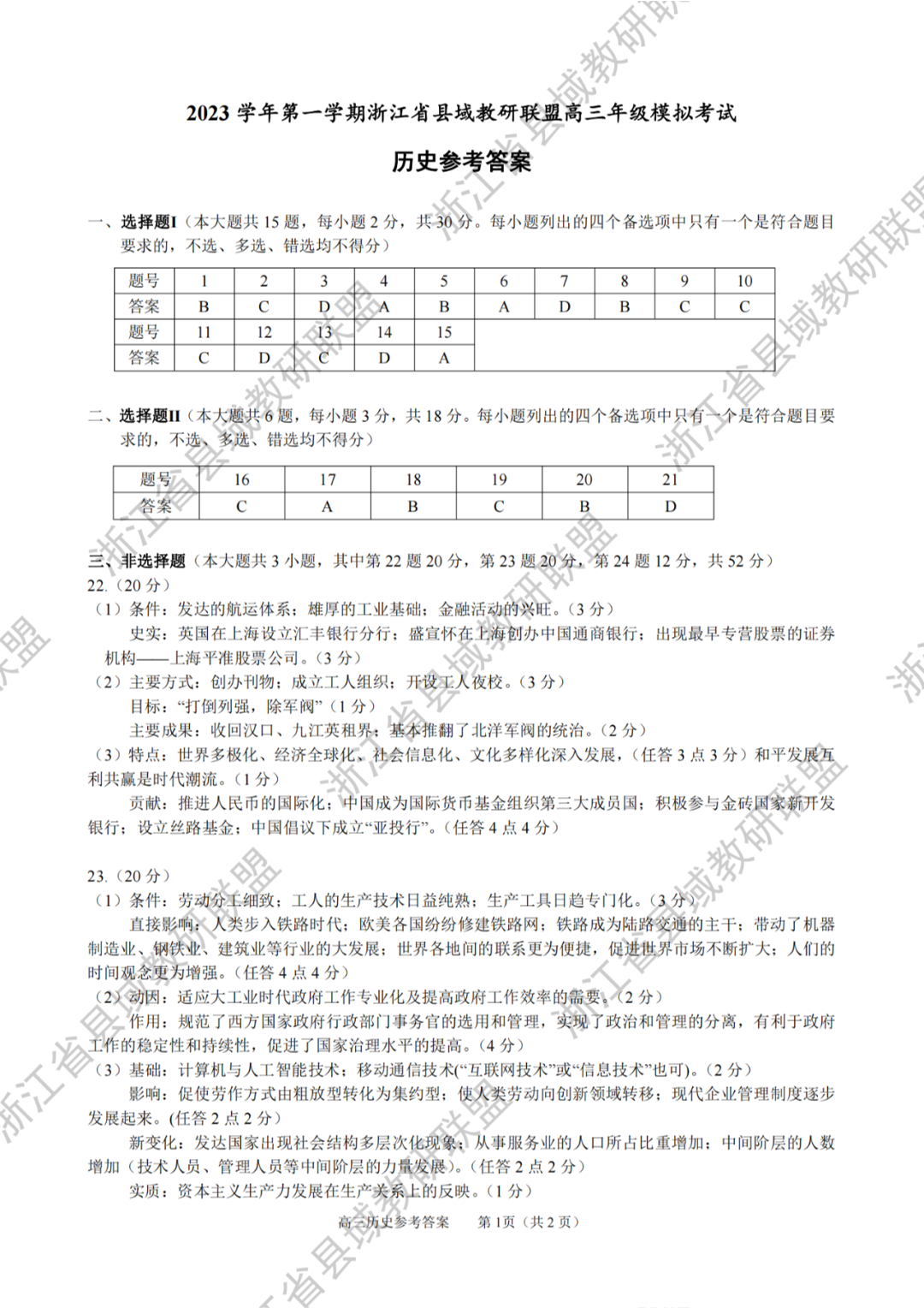 2023学年第一学期浙江省县域教研联盟高三年级模拟考试 历史答案