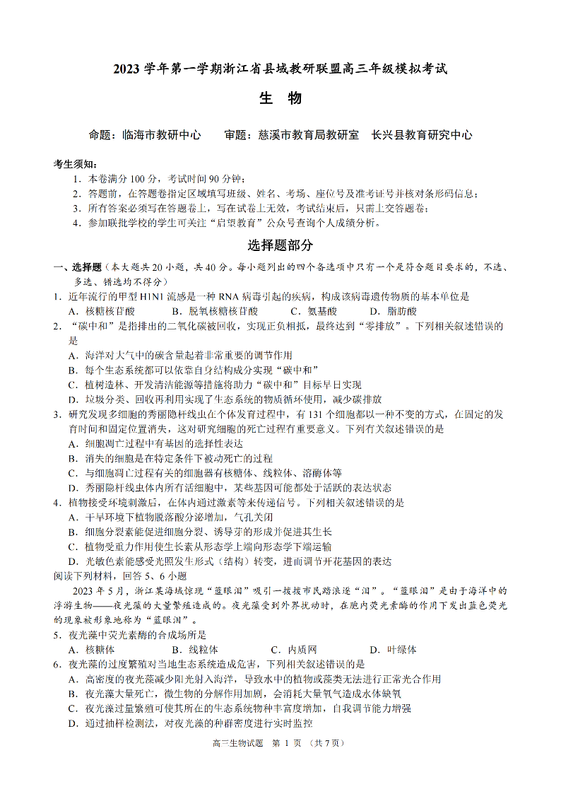 2023学年第一学期浙江省县域教研联盟高三年级模拟考试 生物