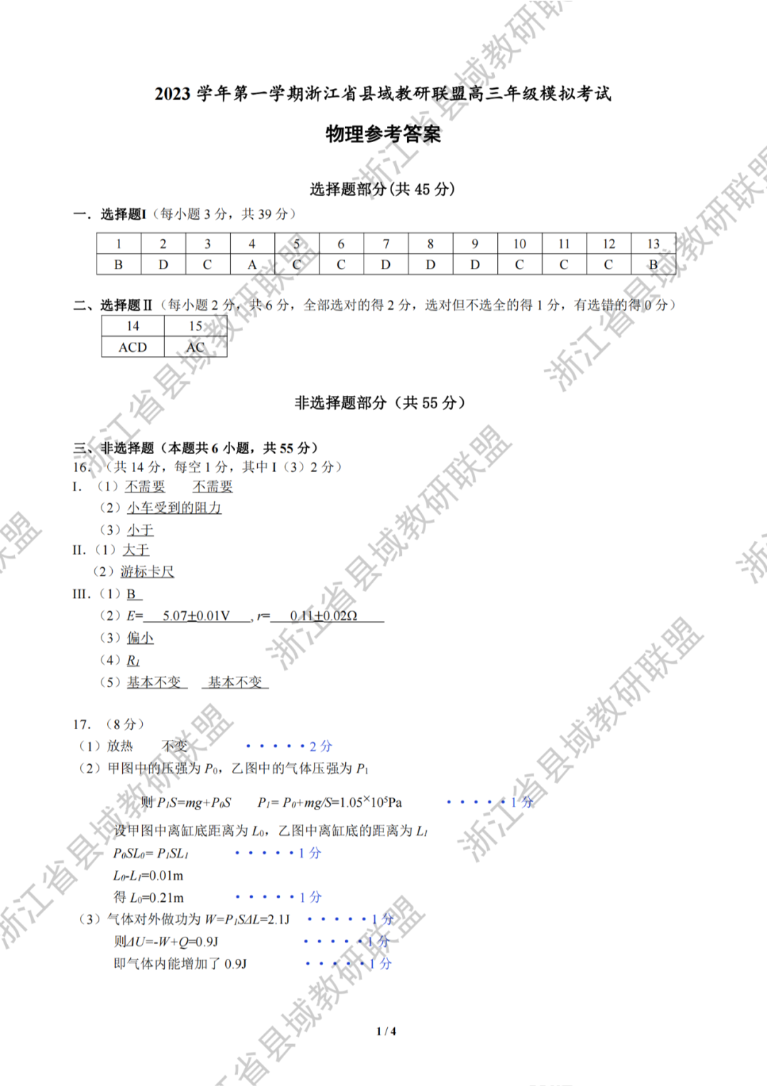 2023学年第一学期浙江省县域教研联盟高三年级模拟考试 物理答案