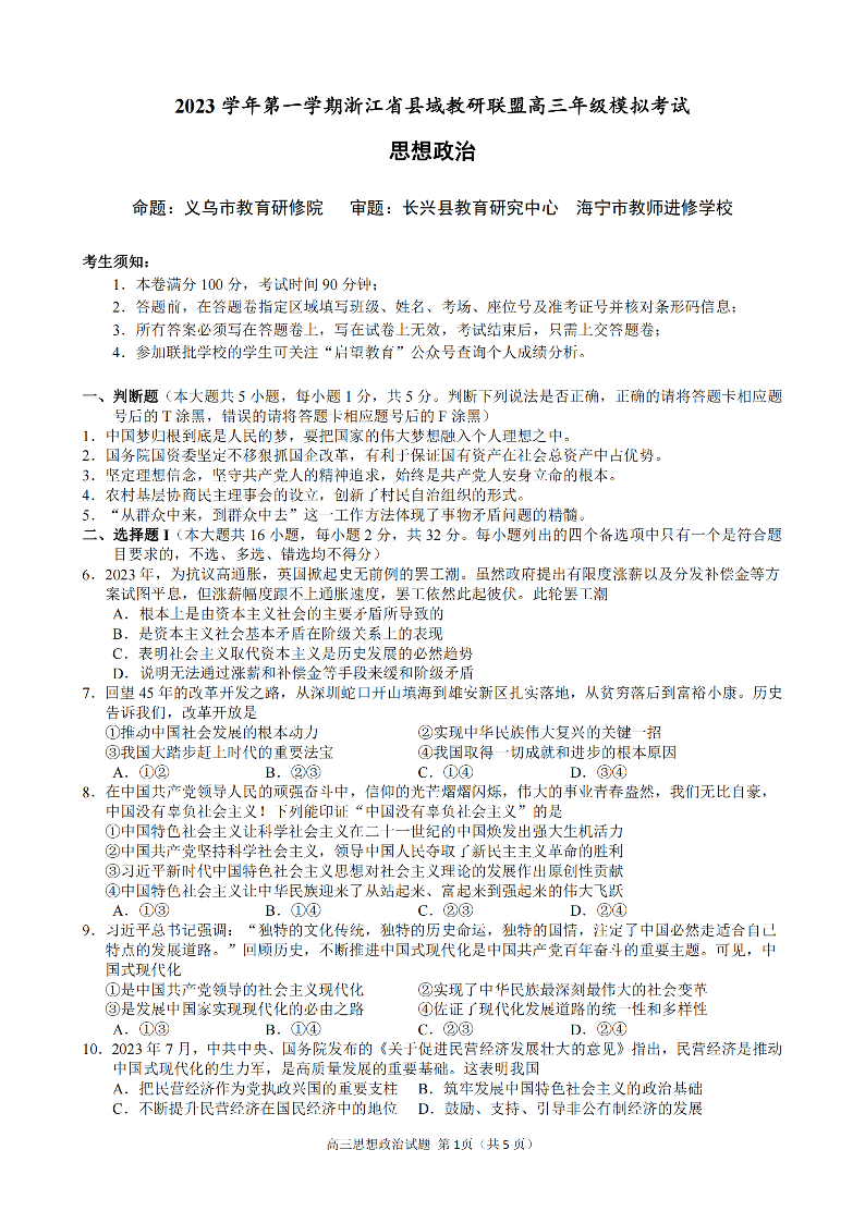 2023学年第一学期浙江省县域教研联盟高三年级模拟考试 政治