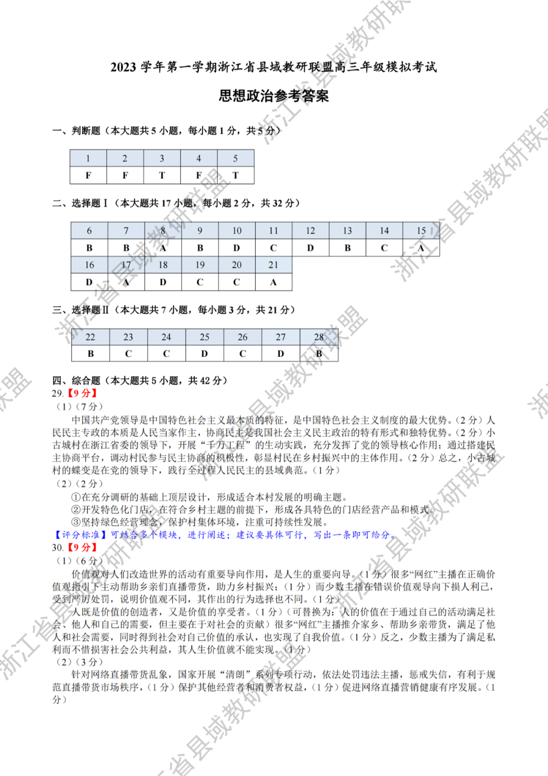 2023学年第一学期浙江省县域教研联盟高三年级模拟考试 政治答案