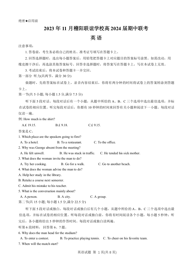 浙江省稽阳联谊学校2023-2024学年高三上学期11月联考 英语