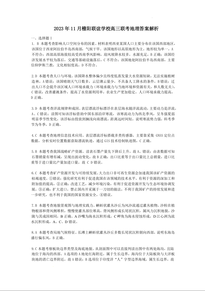 浙江省稽阳联谊学校2023-2024学年高三上学期11月联考 地理答案