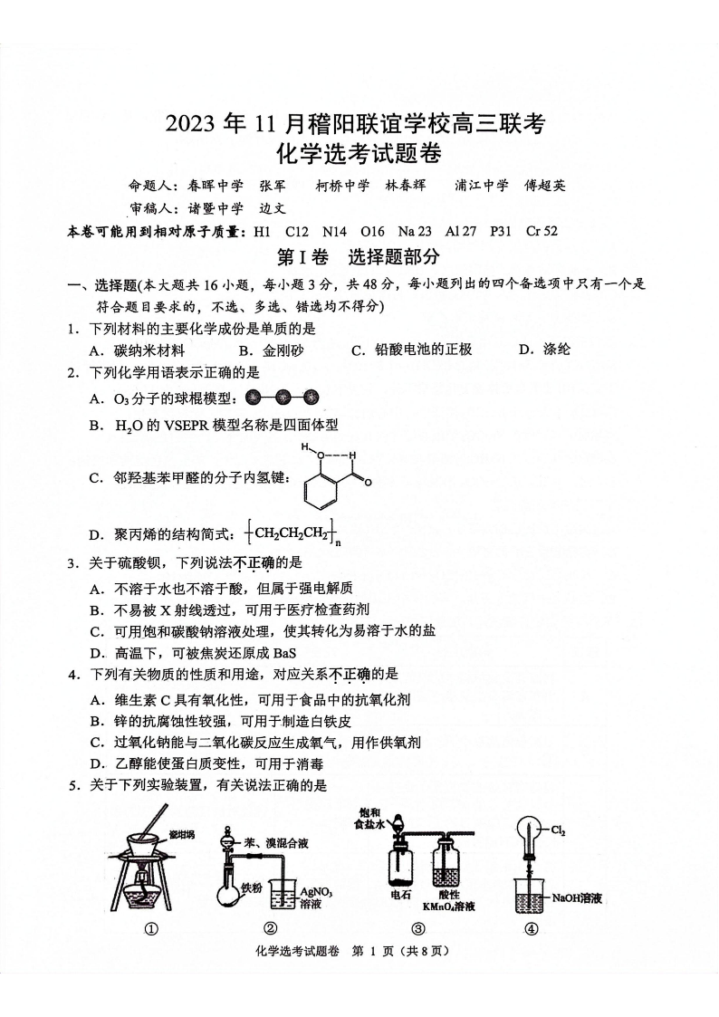 浙江省稽阳联谊学校2023-2024学年高三上学期11月联考 化学