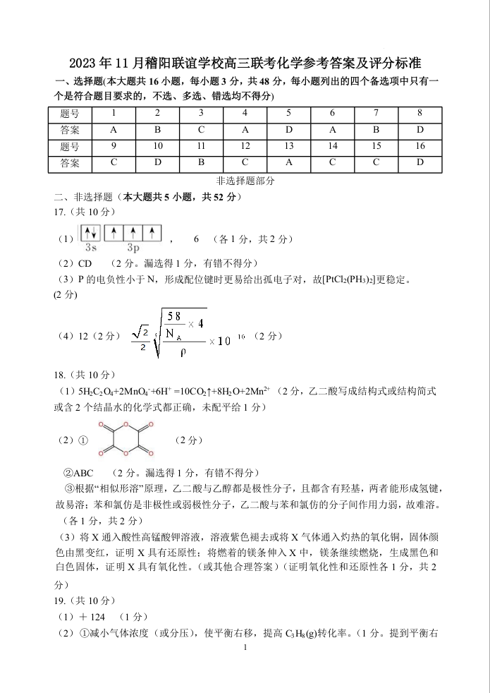 浙江省稽阳联谊学校2023-2024学年高三上学期11月联考 化学答案