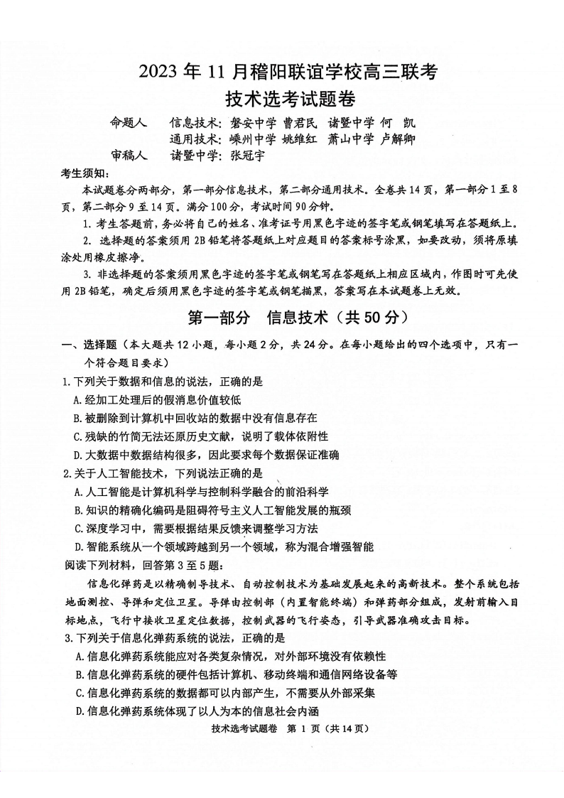 浙江省稽阳联谊学校2023-2024学年高三上学期11月联考 技术
