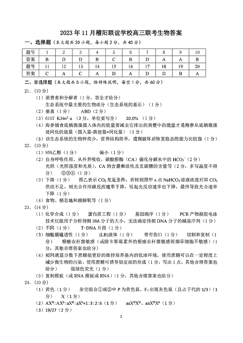 浙江省稽阳联谊学校2023-2024学年高三上学期11月联考 生物答案