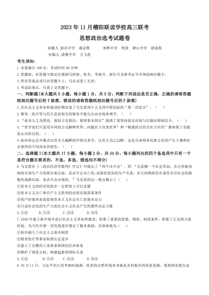 浙江省稽阳联谊学校2023-2024学年高三上学期11月联考 政治