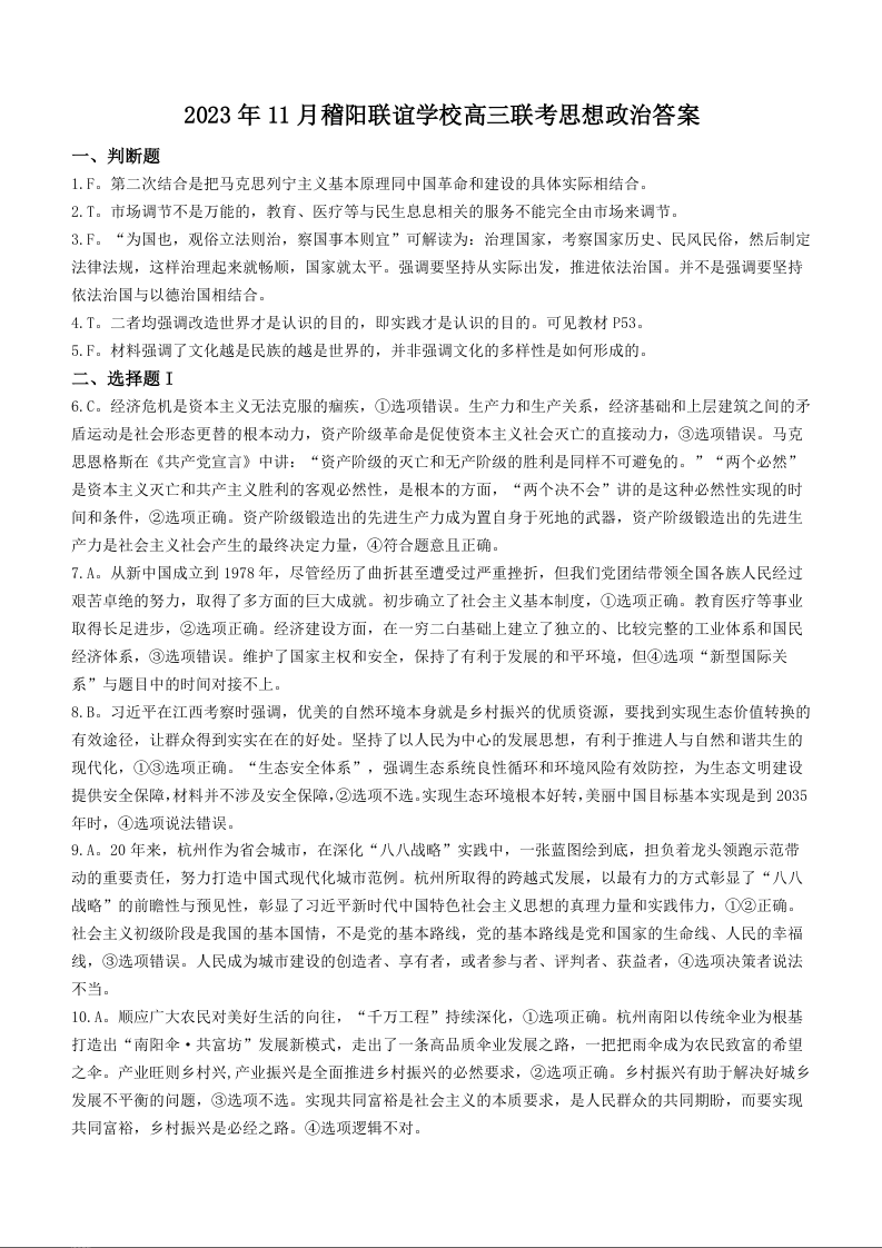 浙江省稽阳联谊学校2023-2024学年高三上学期11月联考 政治答案