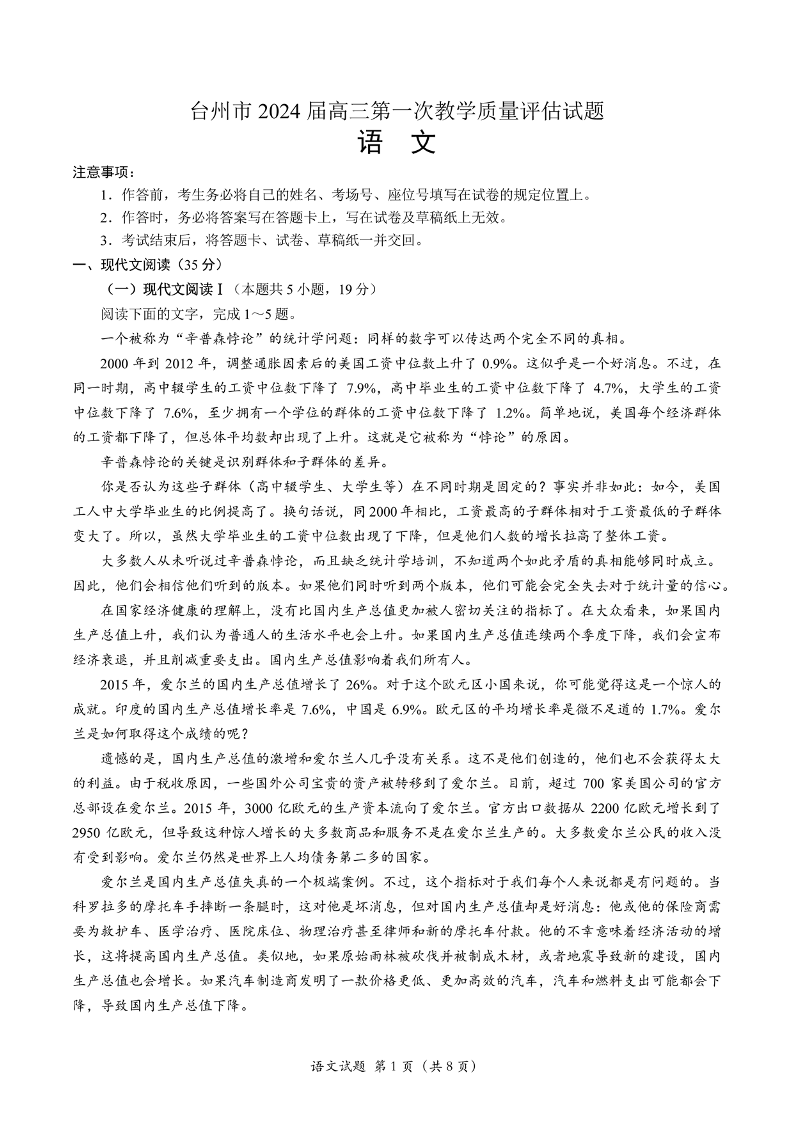 台州市2024届高三第一次教学质量评估试题 语文