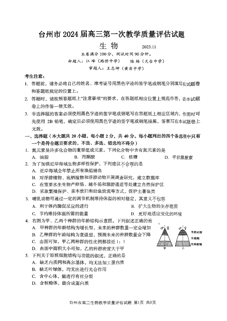 台州市2024届高三第一次教学质量评估试题 生物