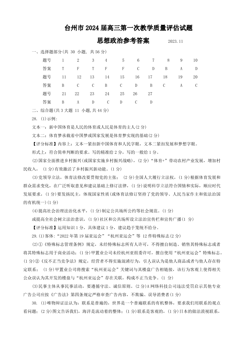 台州市2024届高三第一次教学质量评估试题 政治答案