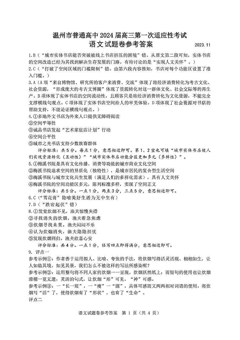 2024届浙江省温州市普通高中高三上学期第一次适应性考试(一模)语文参考答案