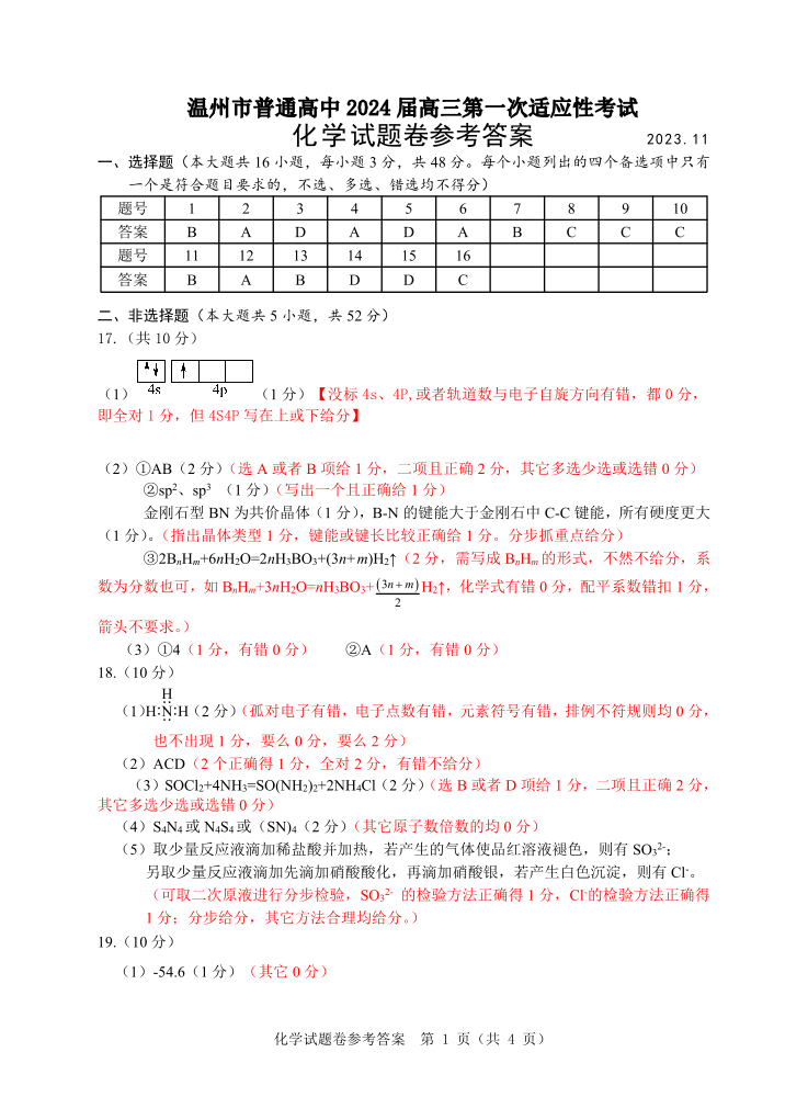 2024届浙江省温州市普通高中高三上学期第一次适应性考试(一模)化学参考答案