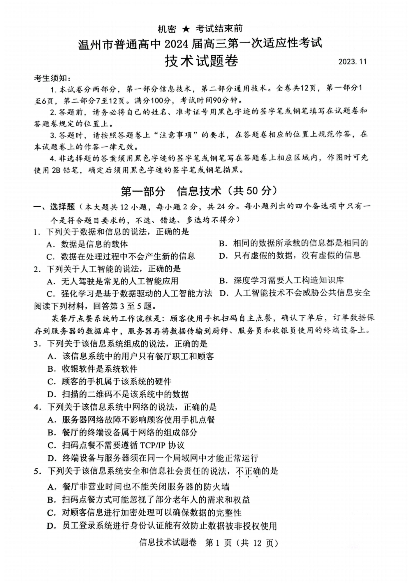 2024届浙江省温州市普通高中高三上学期第一次适应性考试(一模)技术