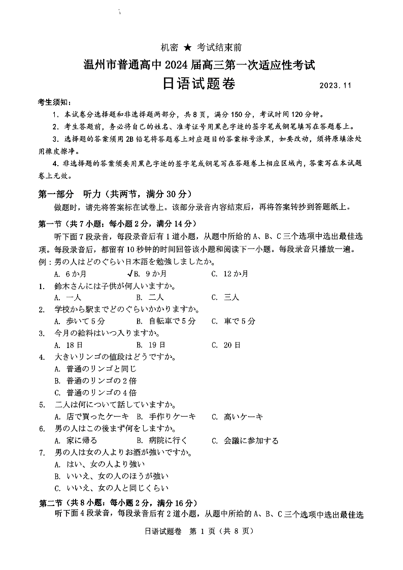 2024届浙江省温州市普通高中高三上学期第一次适应性考试(一模)日语