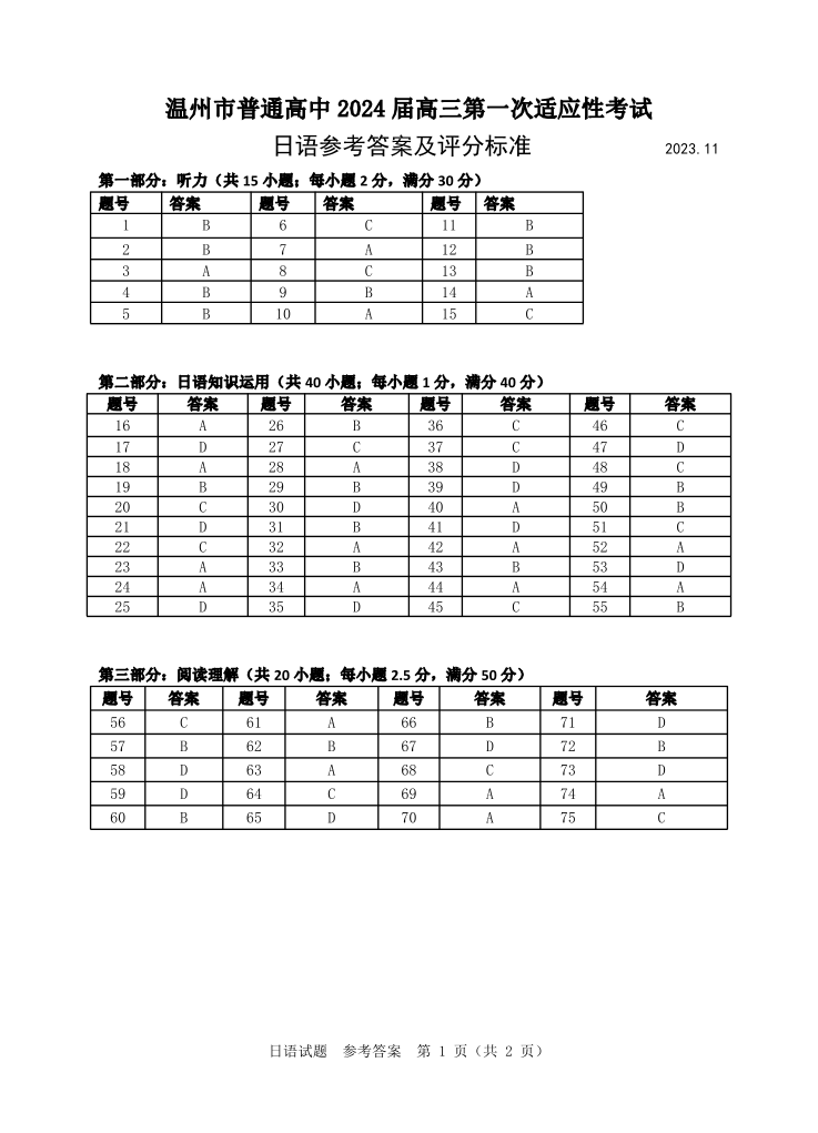 2024届浙江省温州市普通高中高三上学期第一次适应性考试(一模)日语参考答案