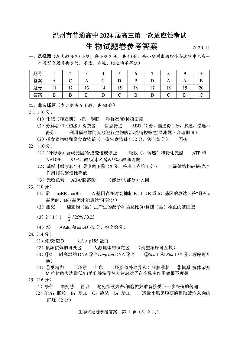 2024届浙江省温州市普通高中高三上学期第一次适应性考试(一模)生物参考答案