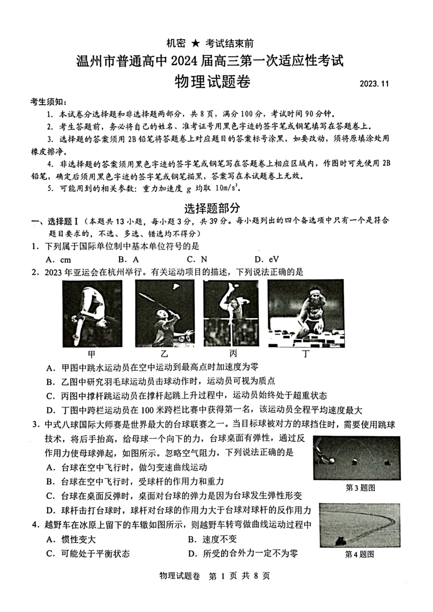 2024届浙江省温州市普通高中高三上学期第一次适应性考试(一模)物理