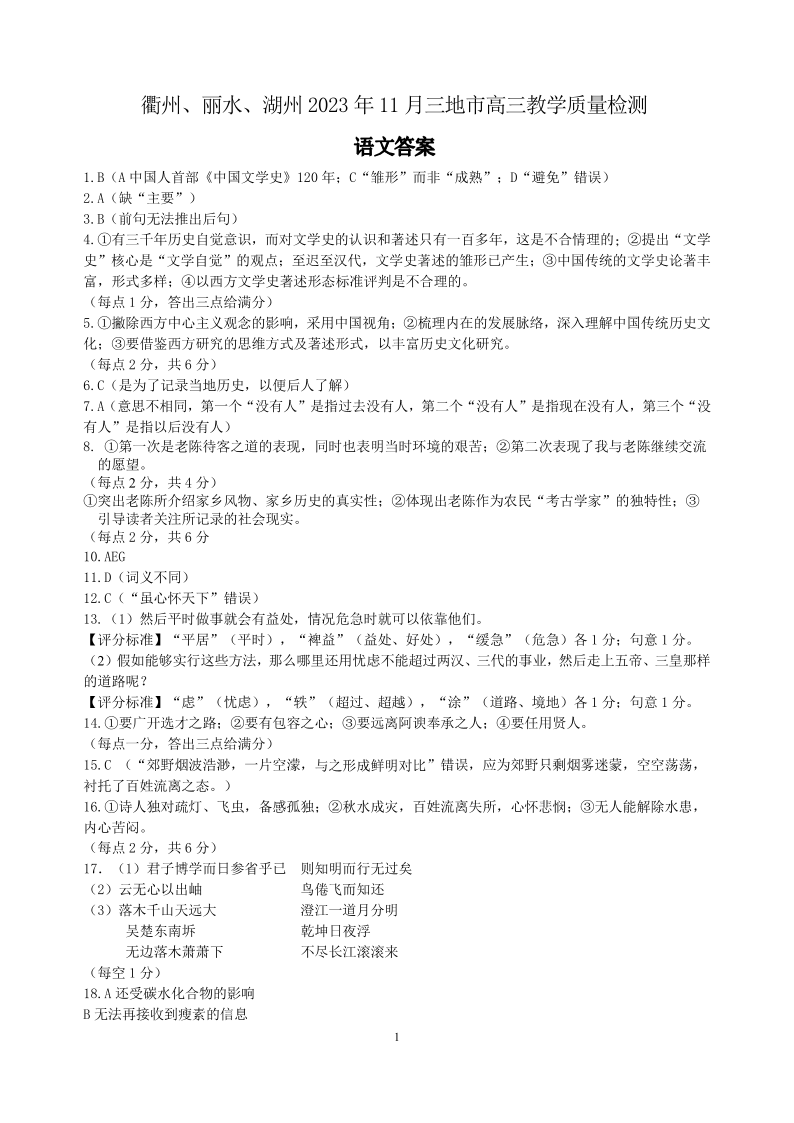 衢州丽水湖州2023年11月三地市高三教学质量检测试 语文答案