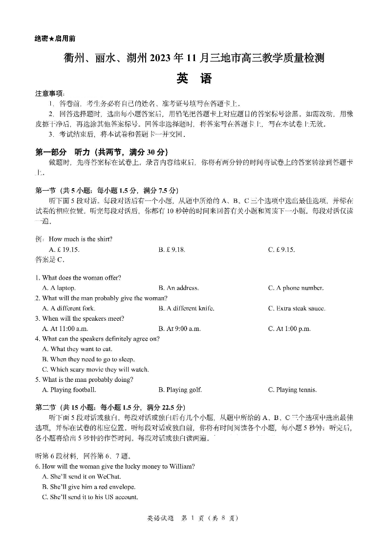 衢州丽水湖州2023年11月三地市高三教学质量检测试 英语