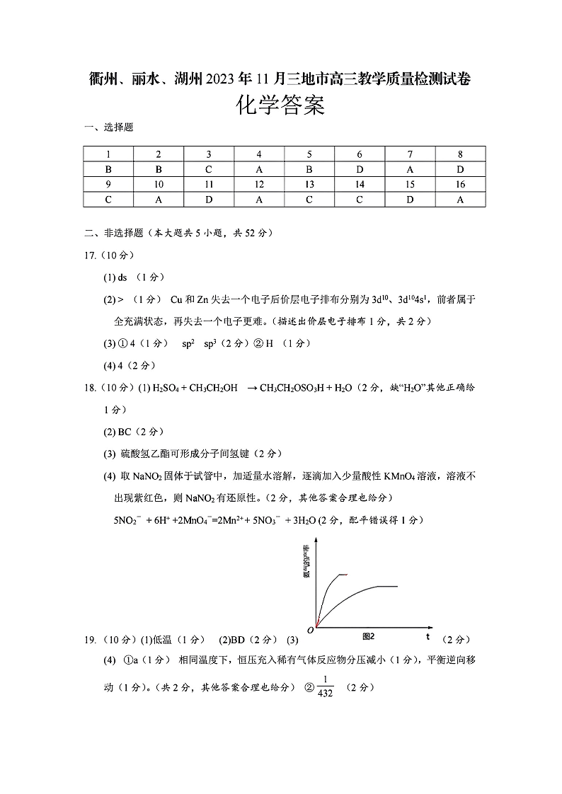 衢州丽水湖州2023年11月三地市高三教学质量检测试 化学答案