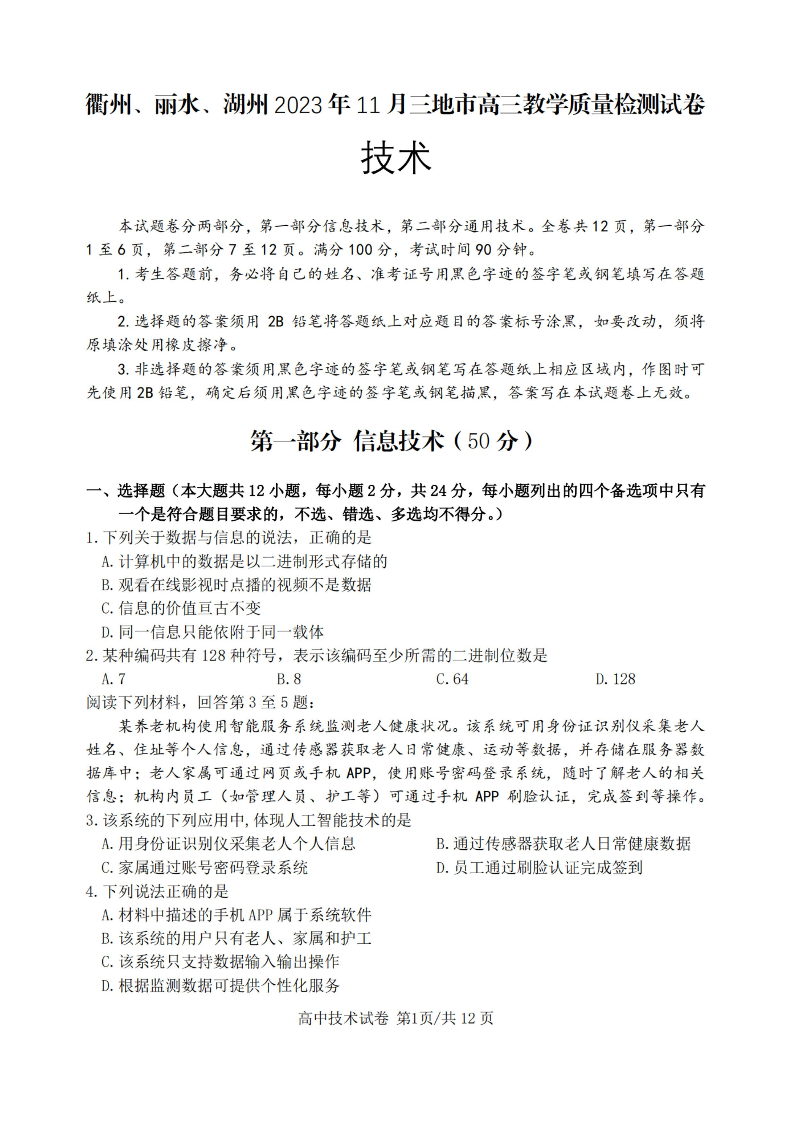 衢州丽水湖州2023年11月三地市高三教学质量检测试 技术