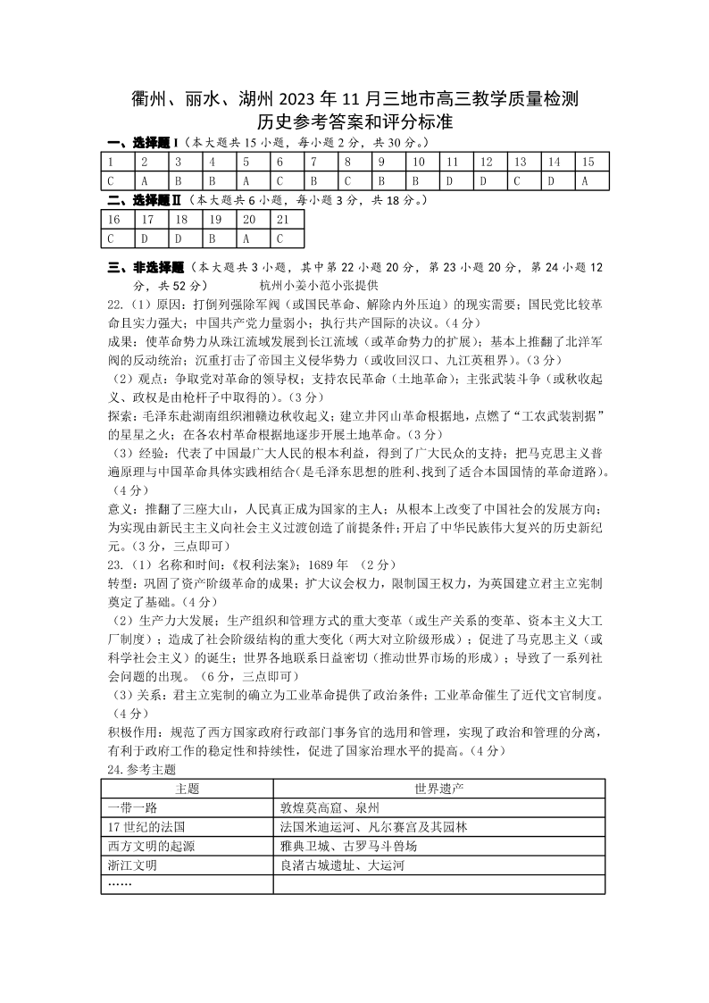 衢州丽水湖州2023年11月三地市高三教学质量检测试 历史答案