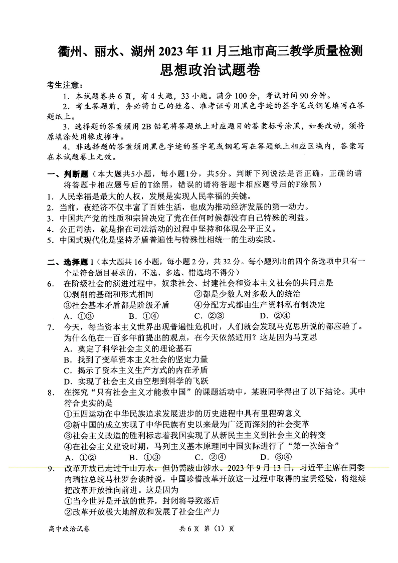 衢州丽水湖州2023年11月三地市高三教学质量检测试 政治