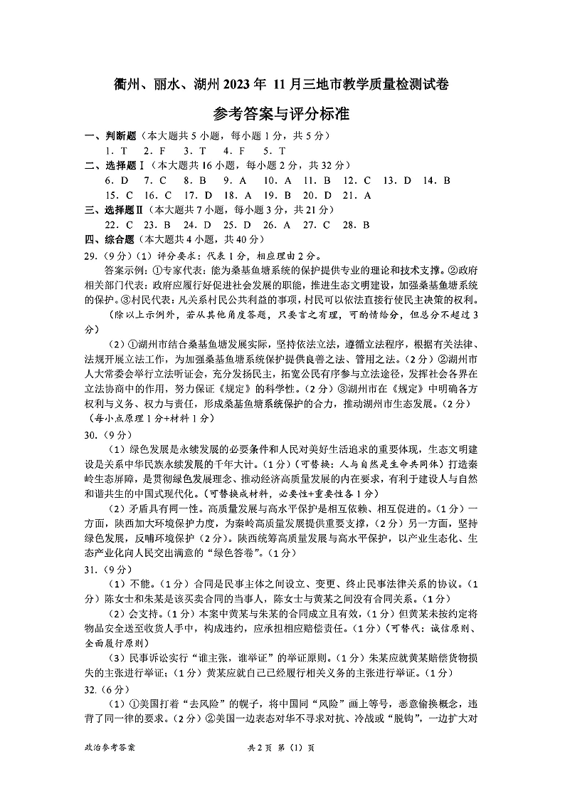 衢州丽水湖州2023年11月三地市高三教学质量检测试 政治答案