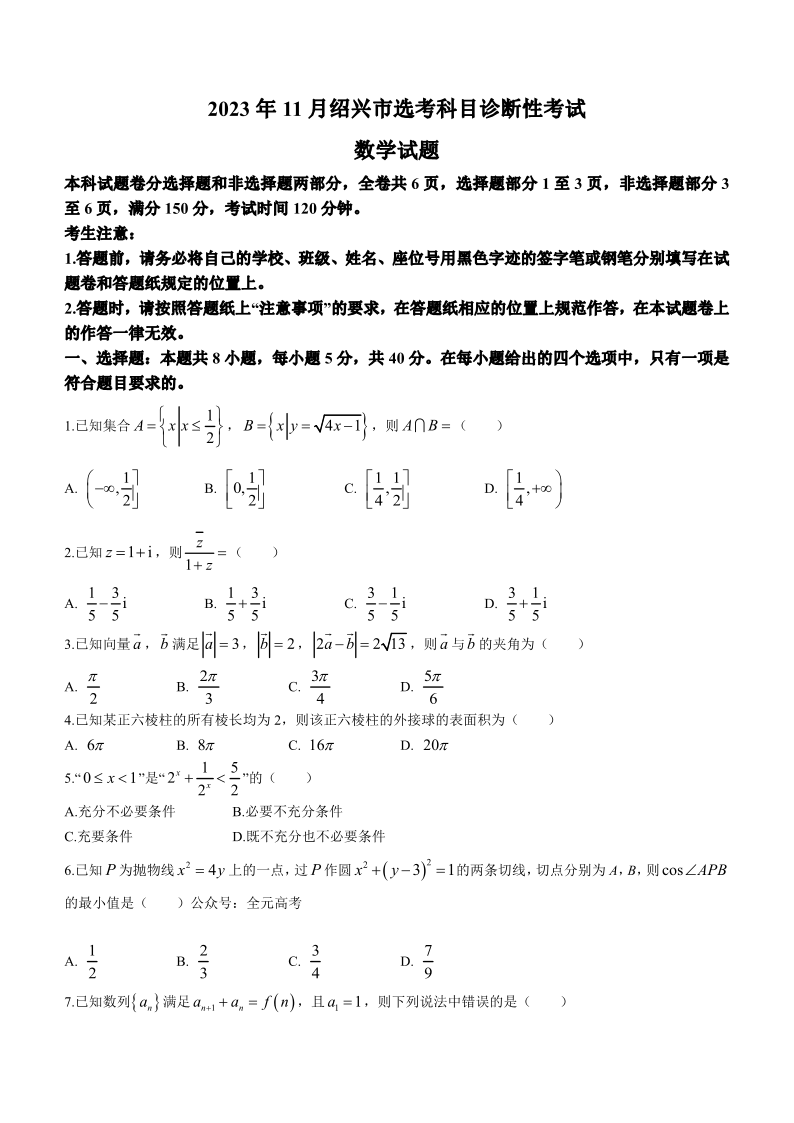 浙江省绍兴市2023-2024学年高三上学期11月选考科目诊断性考试 数学