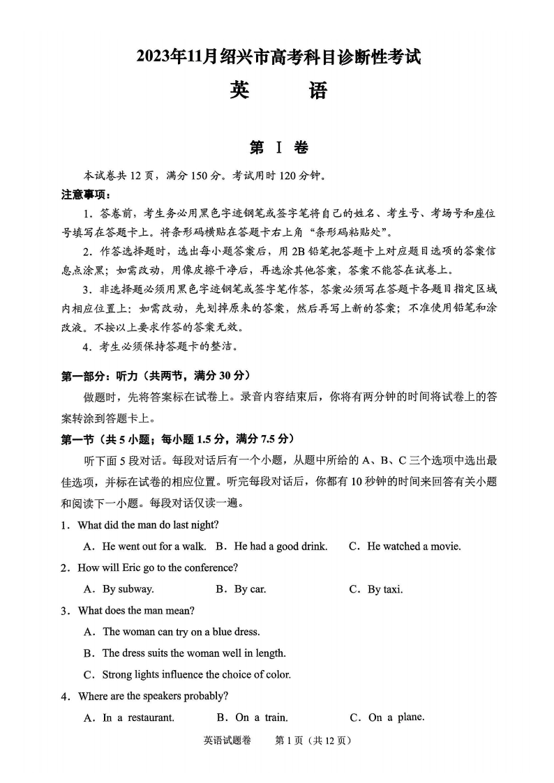 浙江省绍兴市2023-2024学年高三上学期11月选考科目诊断性考试 英语