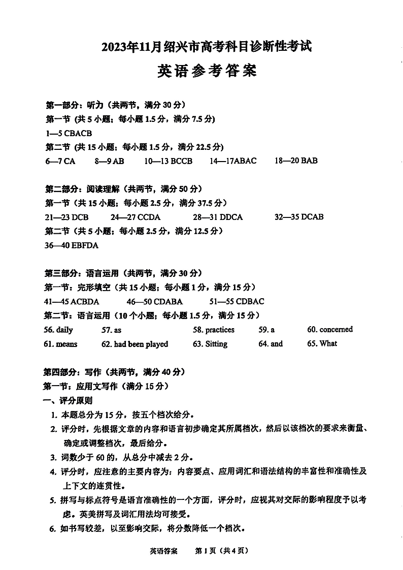 浙江省绍兴市2023-2024学年高三上学期11月选考科目诊断性考试 英语答案