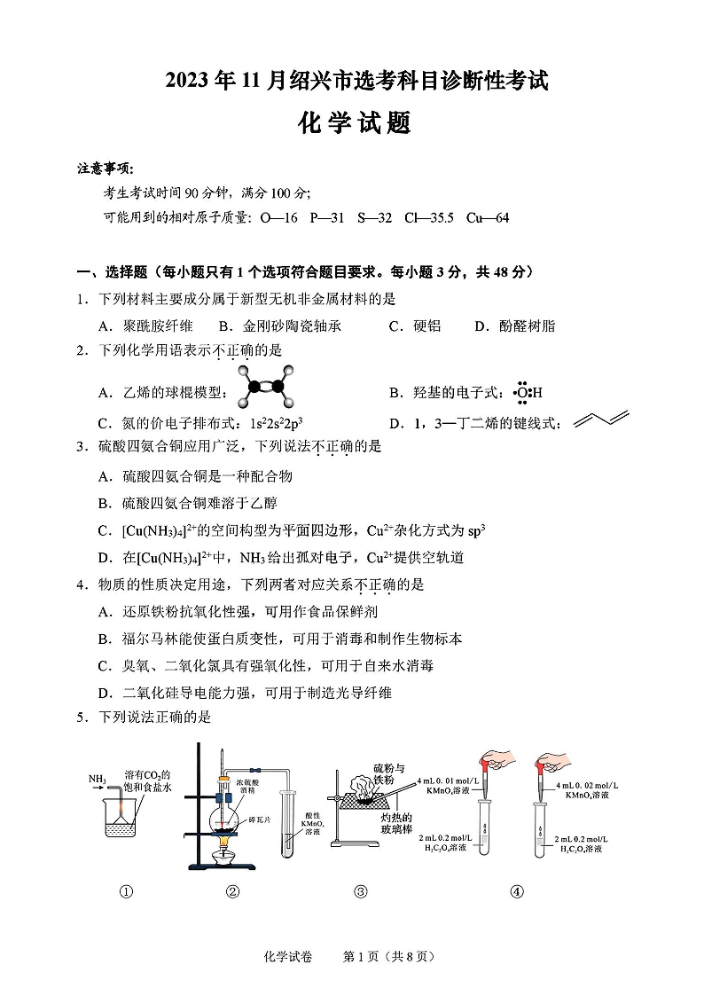 浙江省绍兴市2023-2024学年高三上学期11月选考科目诊断性考试 化学
