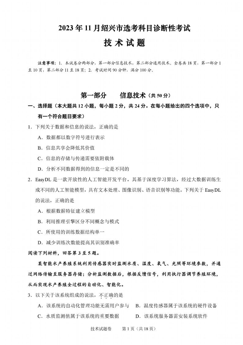 浙江省绍兴市2023-2024学年高三上学期11月选考科目诊断性考试 技术