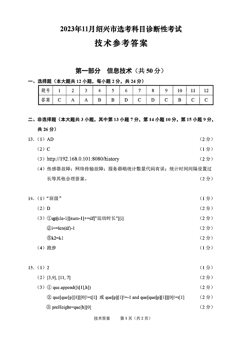 浙江省绍兴市2023-2024学年高三上学期11月选考科目诊断性考试 技术答案