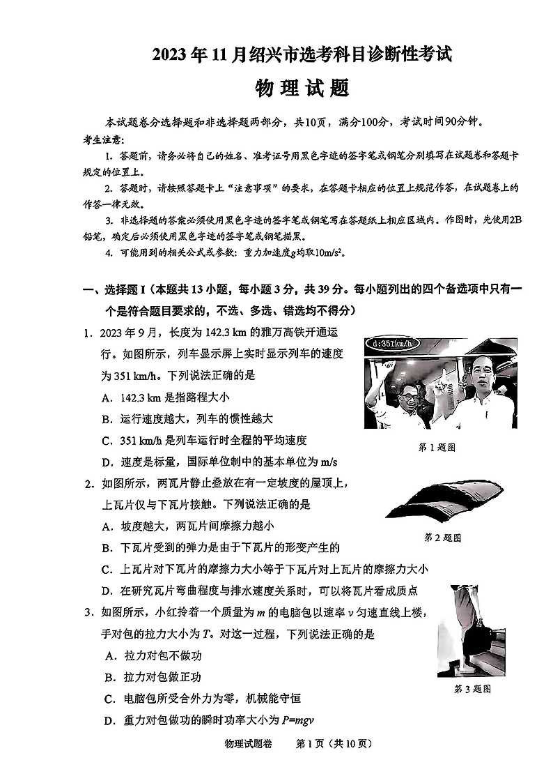浙江省绍兴市2023-2024学年高三上学期11月选考科目诊断性考试 物理
