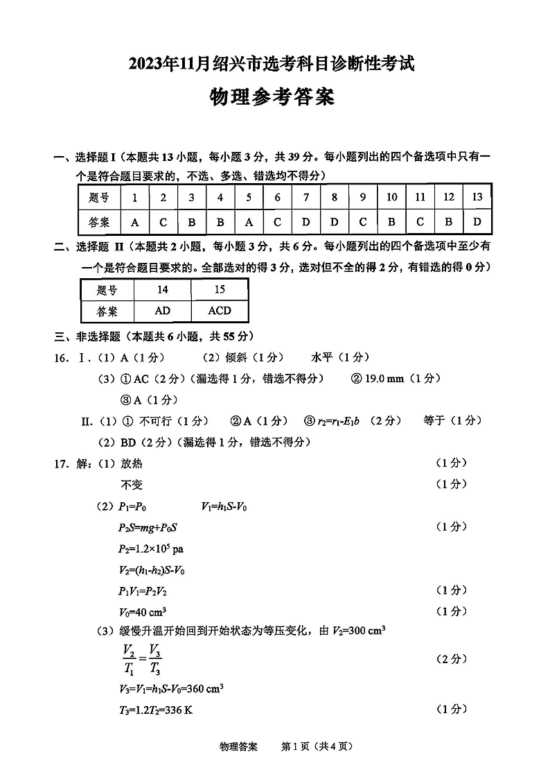 浙江省绍兴市2023-2024学年高三上学期11月选考科目诊断性考试 物理答案