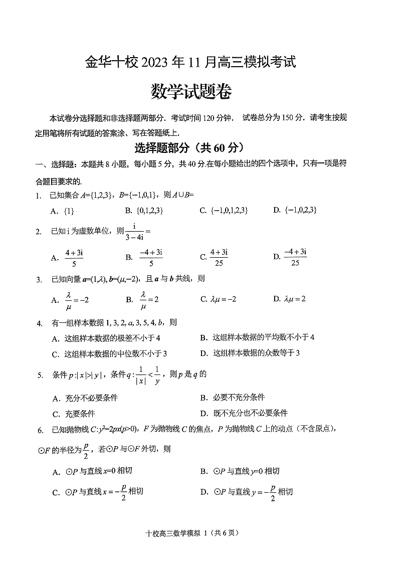 浙江省金华十校2023-2024学年高三上学期11月模拟考试 数学