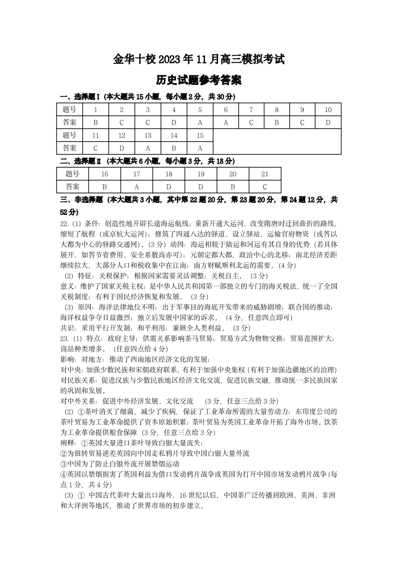 浙江省金华十校2023-2024学年高三上学期11月模拟考试 历史答案