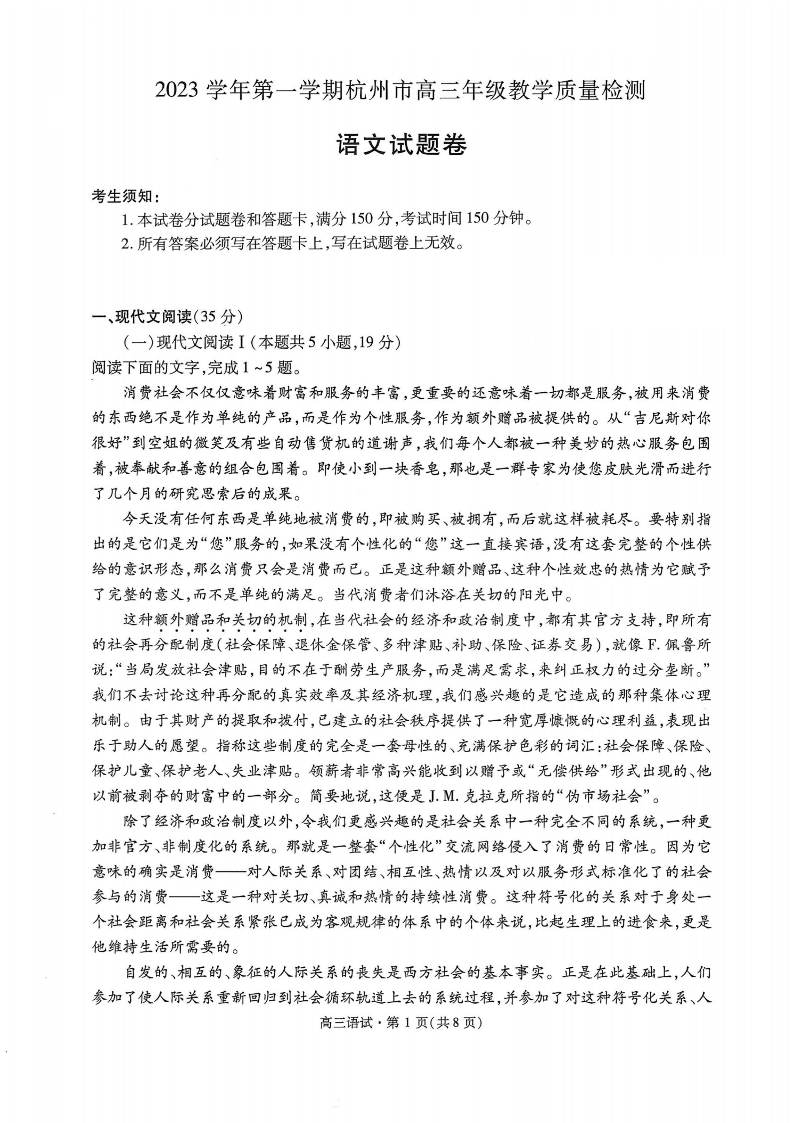 浙江省杭州市2023-2024学年高三上学期期中教学质量检测(一模)语文