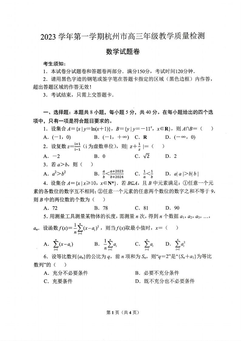 浙江省杭州市2023-2024学年高三上学期期中教学质量检测(一模)数学