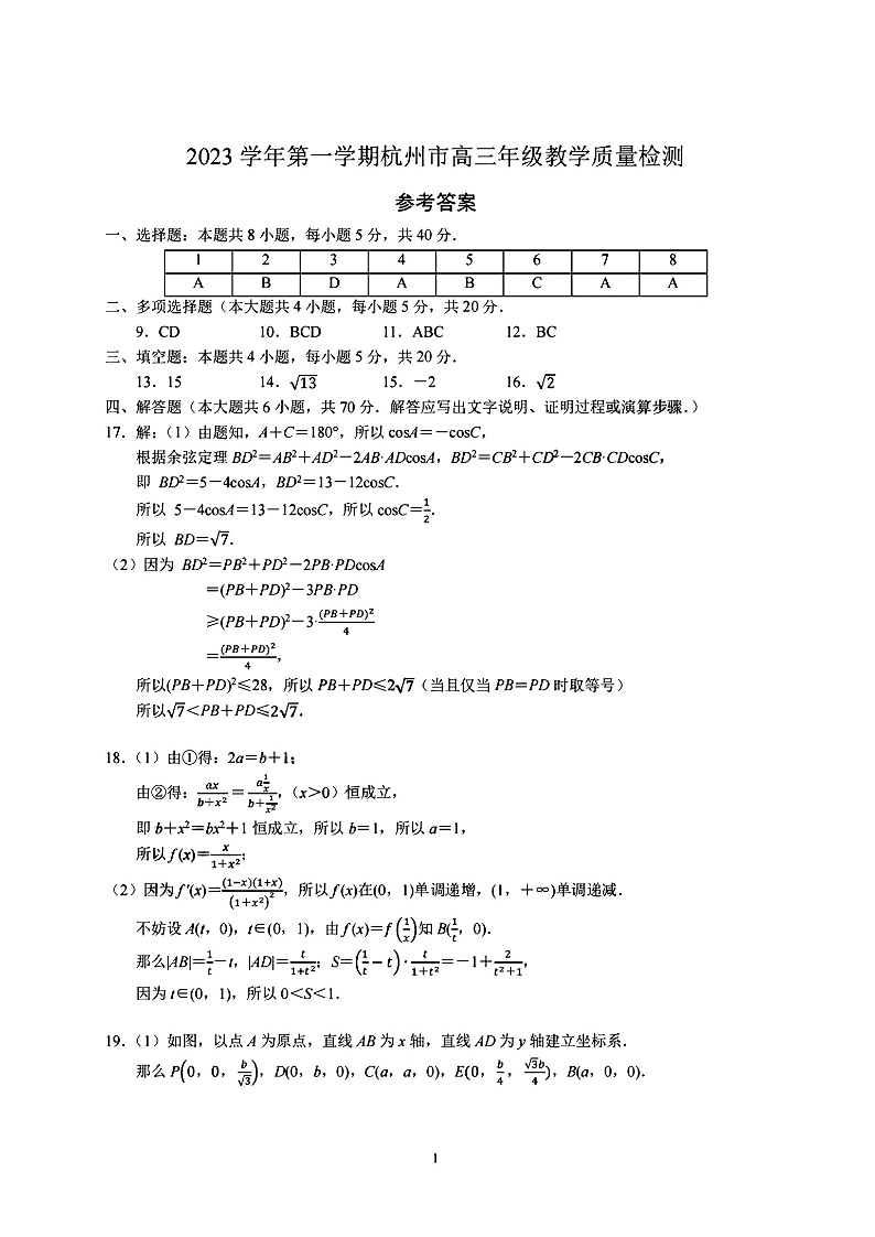 浙江省杭州市2023-2024学年高三上学期期中教学质量检测(一模)数学参考答案