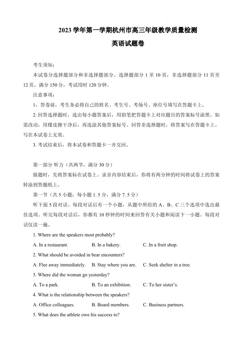 浙江省杭州市2023-2024学年高三上学期期中教学质量检测(一模)英语