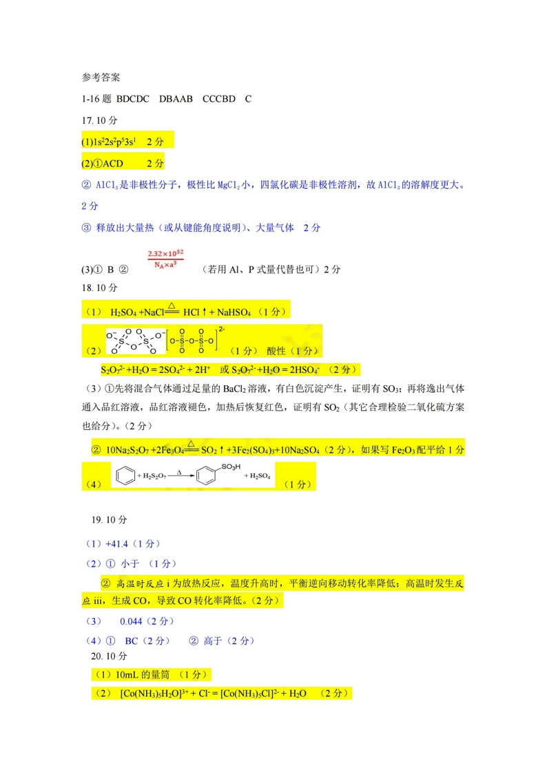 浙江省杭州市2023-2024学年高三上学期期中教学质量检测(一模)化学参考答案