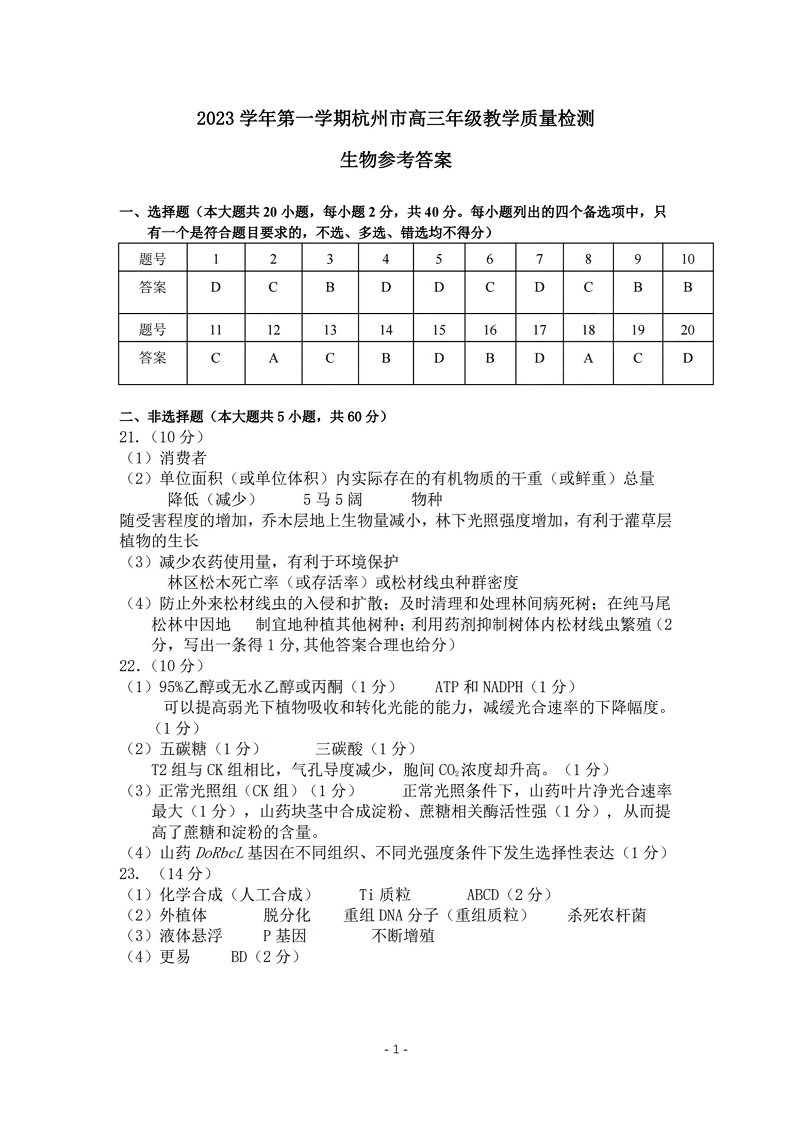 浙江省杭州市2023-2024学年高三上学期期中教学质量检测(一模)生物参考答案