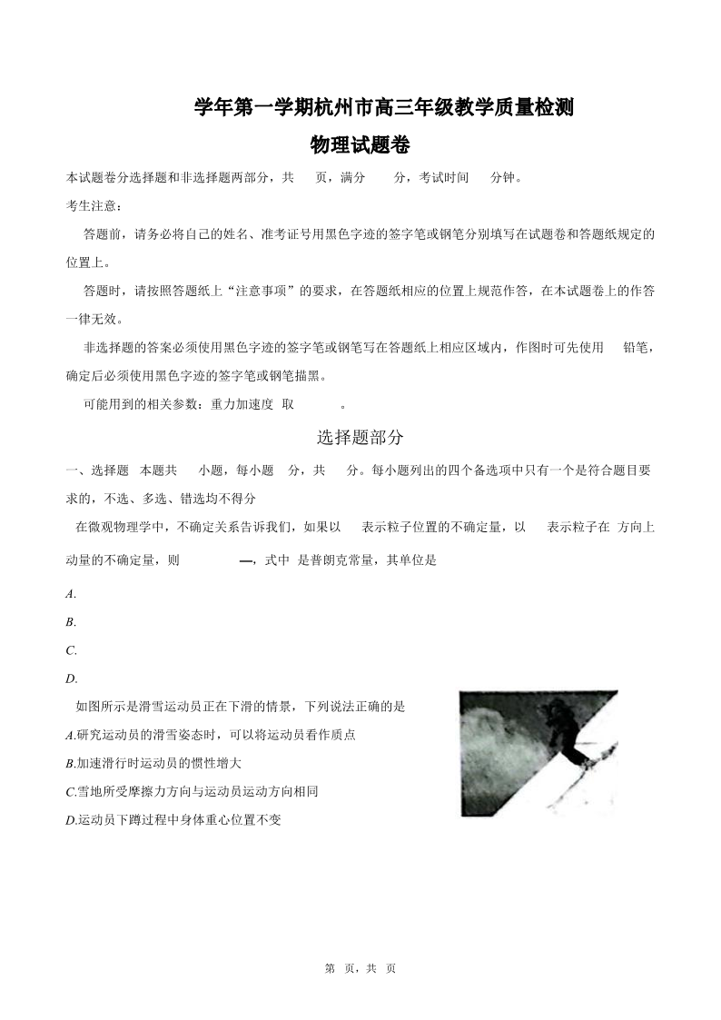 浙江省杭州市2023-2024学年高三上学期期中教学质量检测(一模)物理
