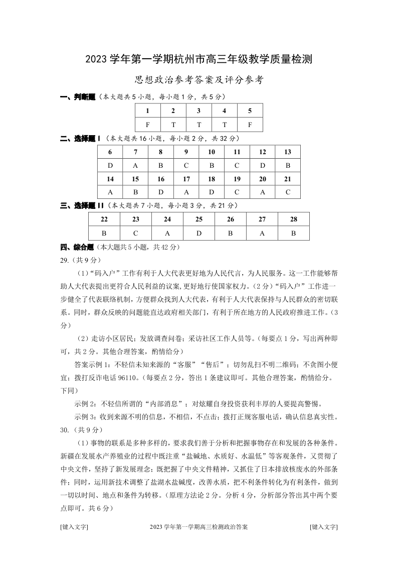 浙江省杭州市2023-2024学年高三上学期期中教学质量检测(一模)政治参考答案